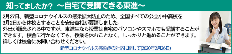 健康と安全が第一ではございますが、このような混乱の中だからこそ、日本・世界の将来を担う東進生には、目標を見失わず、しっかりとした学力をつけるための努力し続けて欲しいと考えています。この機会に、以下画像のご説明に沿って自宅受講環境のご準備頂き、体調不良時、自宅待機の要請があった場合、早朝や帰宅後の学習等に有効活用して頂きたく存じます。